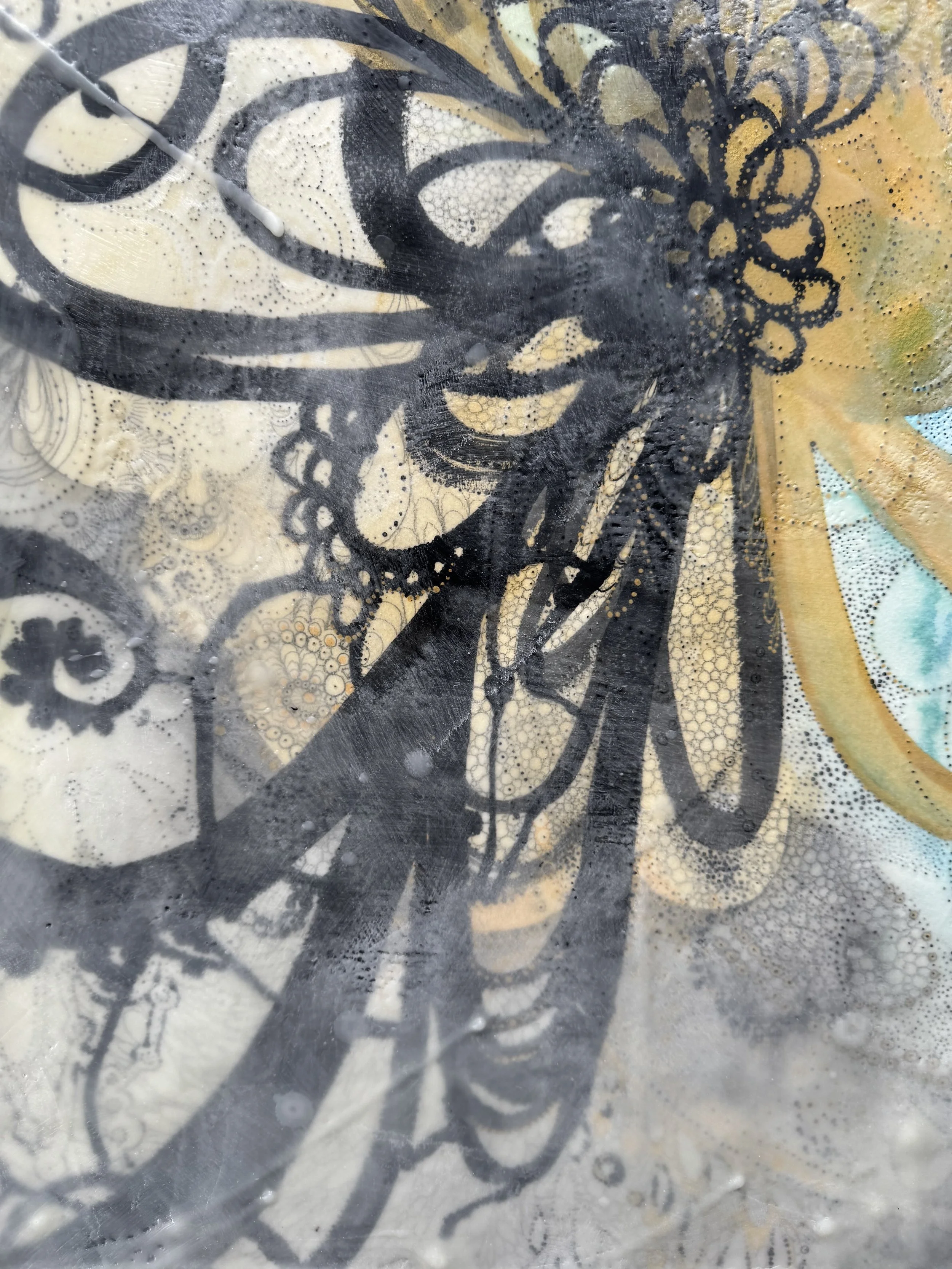 I just realized I had intended to write about the line A box full of darkness because it has become a thread of inspiration for this mixed media work on paper. Lot’s more on that for another time.